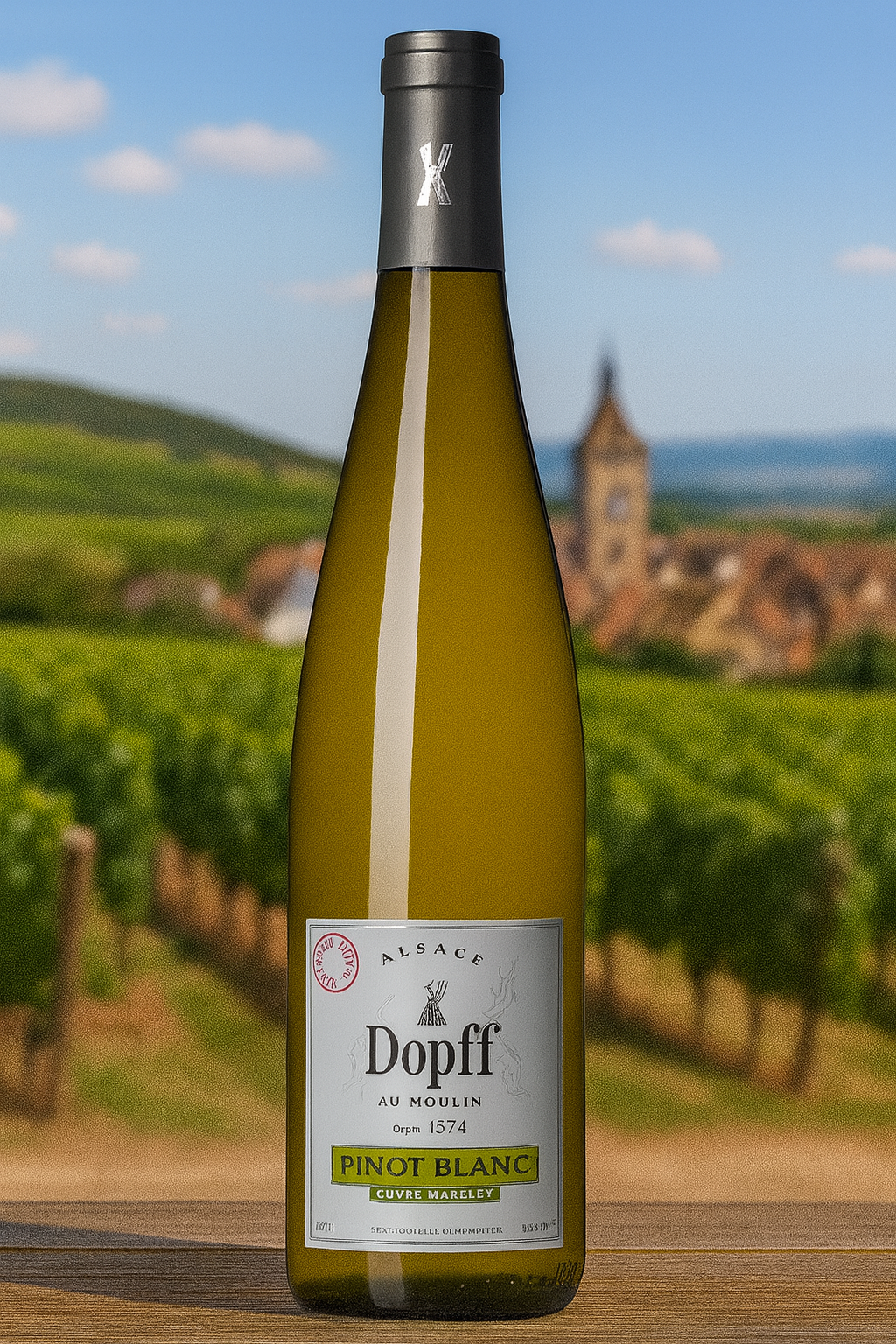 Het huis Dopff, gevestigd in Riquewihr, behoort tot de historische families van de Elzas die al eeuwenlang wijn maken. Hun filosofie is om de klassieke Elzas-druiven in een moderne, toegankelijke stijl te presenteren. De Pinot Blanc Sur Lie is daar een perfect voorbeeld van: de frisse fruitigheid van de druif wordt verrijkt door rijping op de gisten, wat hem diepgang en een gastronomisch karakter geeft. Zo laat Dopff zien dat Pinot Blanc veel meer kan zijn dan alleen licht en simpel.